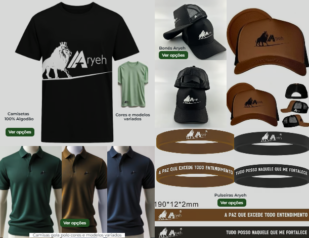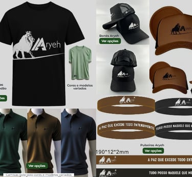 Somos um e-commerce com forte atuação no mercado on-line, especializado em bonés, camisetas e pulseiras personalizadas. A nossa marca ARYEH continuará criando desde peças discretas somente com a marca para pessoas que gostam de peças mais discretas, bem como peças com mensagens inspiradas nas Escrituras Sagradas. O intuito da marca, acima de tudo, é levar aos nossos clientes produtos de alta qualidade com expressões de fé que não apenas vestem o corpo, mas também tocam o espírito.
